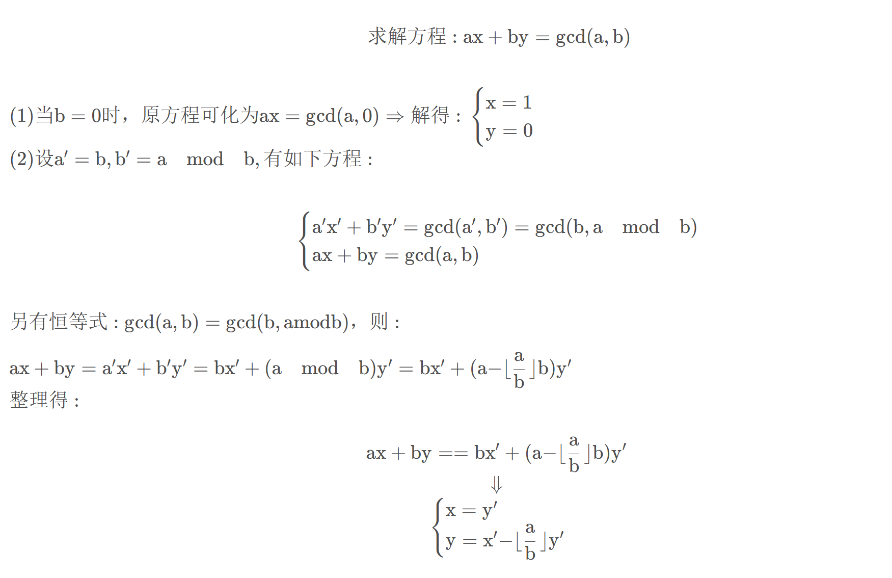 x, y, gcd = ext_gcd(b, a % b) #递归直至余数等于0(需多递归一层用来判断)